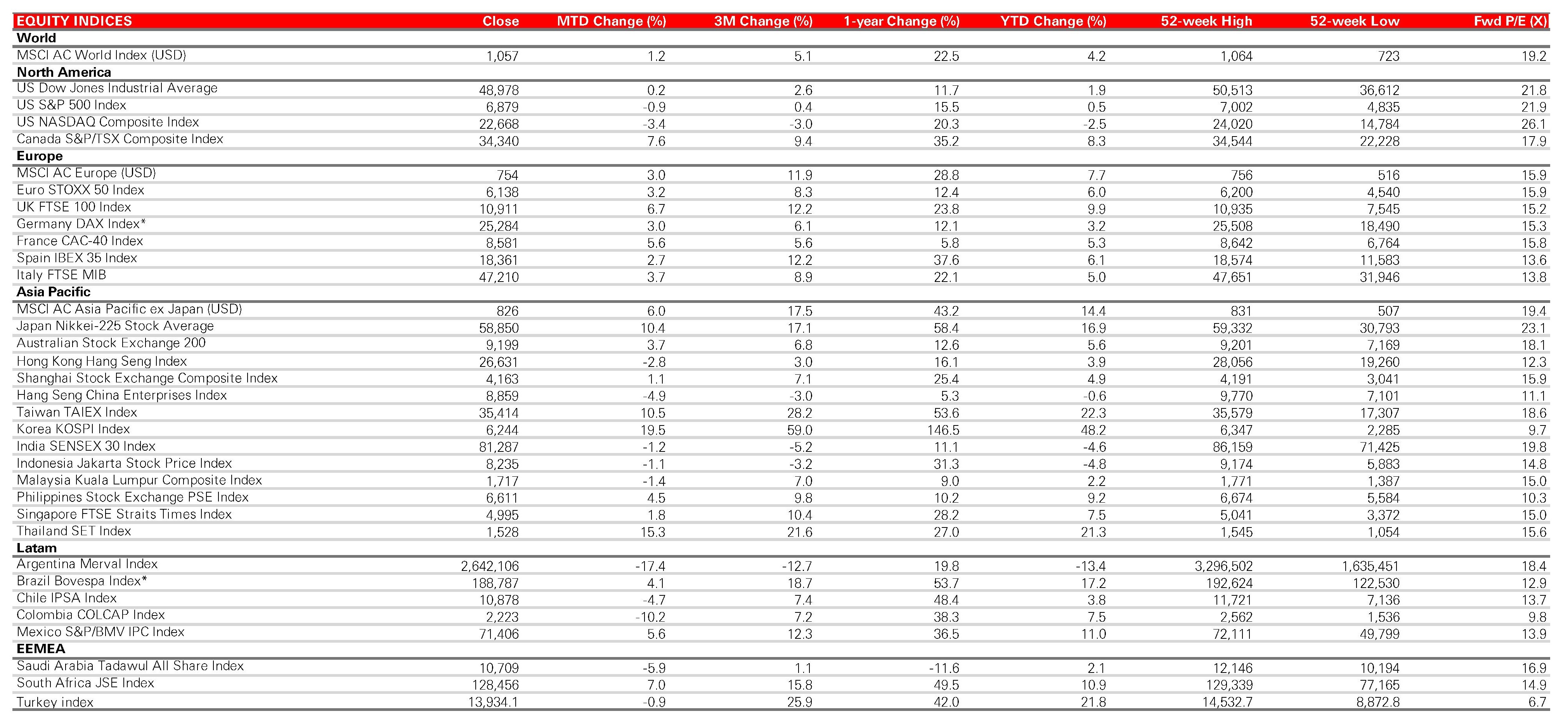 Sources: Bloomberg, HSBC Asset Management. Data as at close of business 28 February 2026. (*) Indices expressed as total returns. All others are price returns.