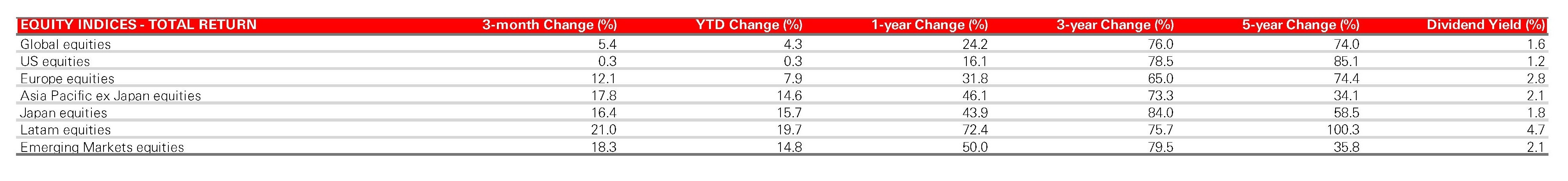 Data sourced from MSCI AC World Total Return Index, MSCI USA Total Return Index, MSCI AC Europe Total Return Index, MSCI AC Asia Pacific ex Japan Total Return Index, MSCI Japan Total Return Index, MSCI Latam Total Return Index and MSCI Emerging Markets Total Return Index.