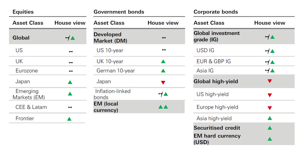 • Icons: ↑ View on this asset class has been upgraded – No change ↓ View on this asset class has been downgraded