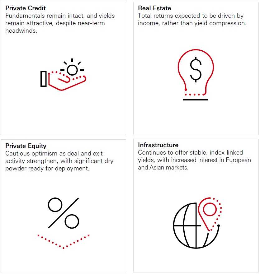 - In Real Estate, we hold a ‘Neutral / Positive’ outlook for the asset class. As investor sentiment has improved, investment volumes increased in 2025, driven by a strong end to the year. Total returns in Real Estate are expected to be driven by income, rather than yield compression as high-quality office and retail sectors are expected to perform particularly well